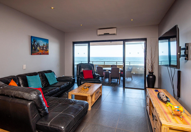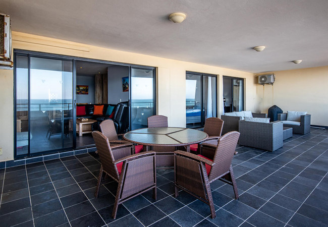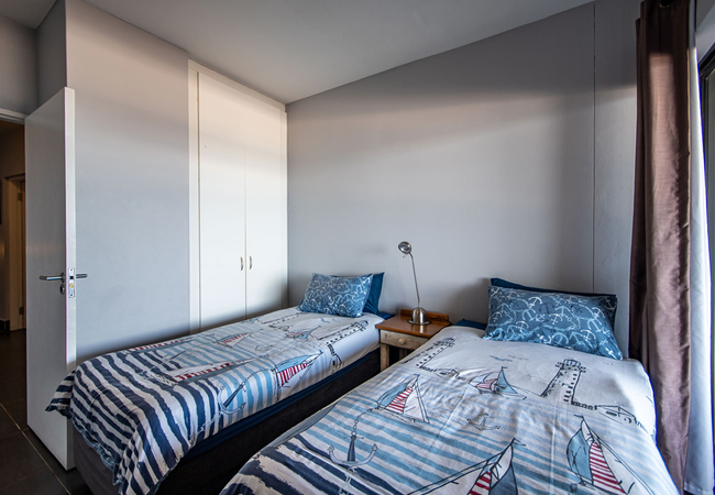 Lazy Lizard 23 is a large, three bedroom holiday apartment (sleeps six guests) that is a must for a big family. This glorious unit is light and modern, sleeping six guests in three bedrooms. The main bedroom has a double bed, a dressing table and sliding doors that lead out to the balcony. The second bedroom has two single beds and the third bedroom has split bunk beds. There are 2 bathrooms in the apartment. The Lazy Lizard 23 apartment is comfortable and the lounge area is a great place to relax and unwind on the couch in front of the TV watching your favourite DStv channel. The dining area sits alongside the lounge and next to the kitchen. The fully equipped kitchen contains a washing machine, tumble dryer, oven, stove top, fridge / freezer, kettle, crockery and cutlery. The patio is a real treat and boasts a dining table and a lounge suite all under cover, allowing you to dine alfresco or sit comfortably with your family and friends while admiring the remarkable view. The complex itself has a swimming pool, braai / barbeque facilities and secure parking.