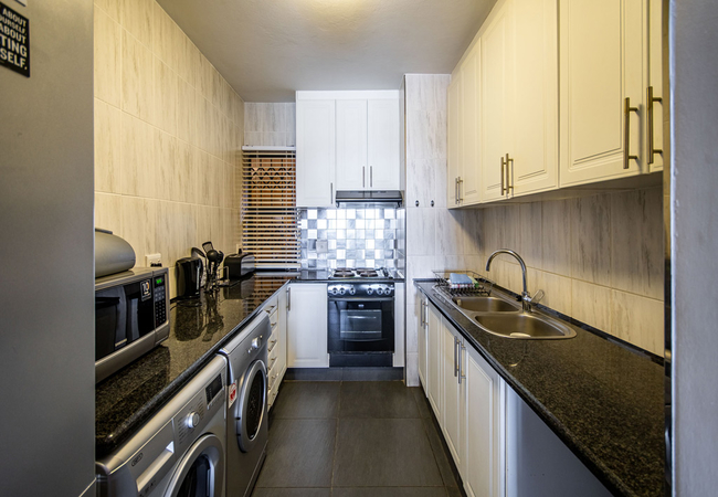 The fully equipped kitchen contains a washing machine, tumble dryer, oven, stove top, fridge / freezer, kettle, crockery and cutlery.