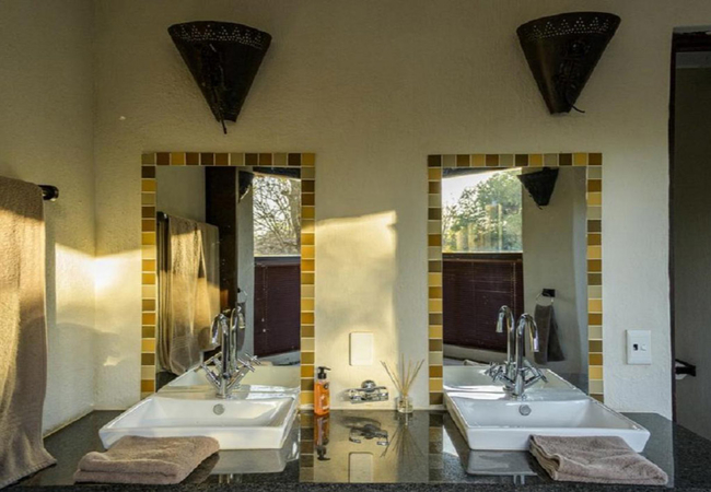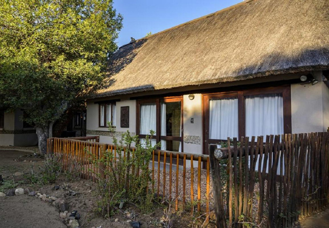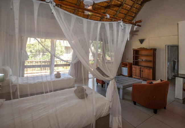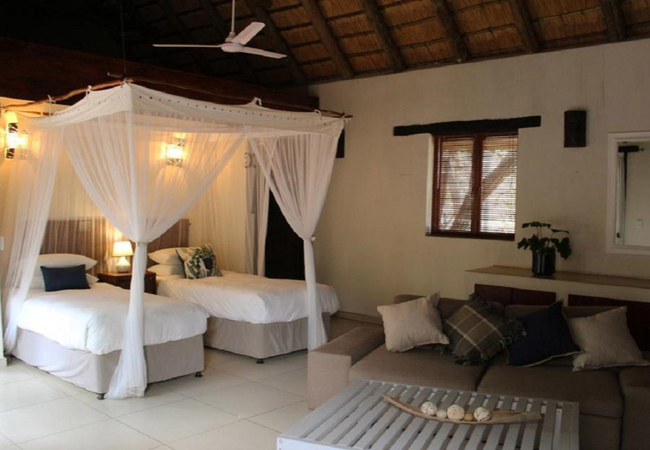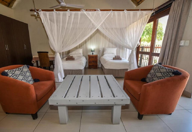 The Family Room has two bedrooms each with two Twin beds. The main bedroom has an en-suite with outside shower and the main bathroom is fitted with a bath. Free Wi-Fi is provided. Guests have access to a fully equipped kitchen, lounge, deck and braai area with a spectacular pool overlooking the Mohlabetsi riverbed.