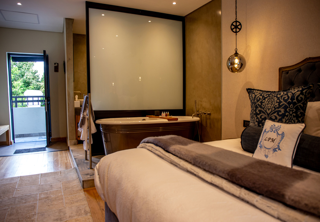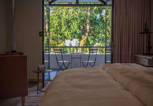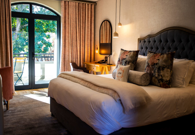 Each room contains an extra length King-size bed, an en-suite bathroom, air-conditioning, a fireplace, safe, bar fridge and a Nespresso machine along with tea / coffee-making facilities. A balcony offers views overlooking the Franschhoek Mountains.