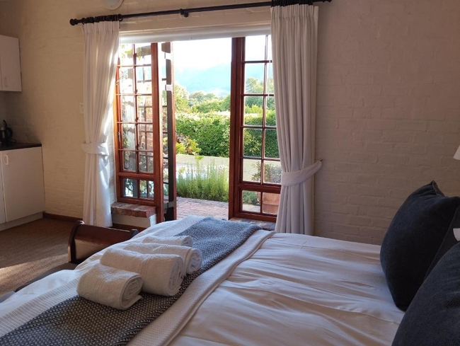 Four double en-suite rooms are simply and elegantly decorated with cool, crisp white linen and contrasting cushions and furniture. Enjoy a pre-breakfast swim in the pool and relax in the evenings on your patio with a sundowner while watching the last rays of the sun disappear behind the mountain. All rooms have private entrances.