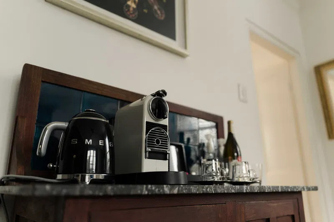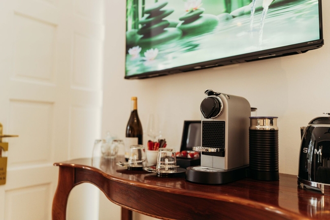 Our luxuriously appointed Superior King Suite 4 offers fantastic accommodations. You'll relax in an inviting king-size bed, which can also be converted into a room with two twin beds, and a separate bathroom with a shower, decorated in shades of beige, gold and black. In-room amenities during your stay: The suite has a Nespresso machine with complimentary coffee pods, a small kettle for tea, complimentary toiletries in the bathroom (shampoo/conditioner/soap/body wash), a hairdryer, a small refrigerator with two complimentary bottles of water, individual air conditioning, and a 32inc TV with Netflix.