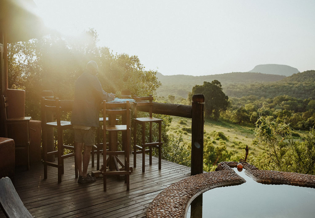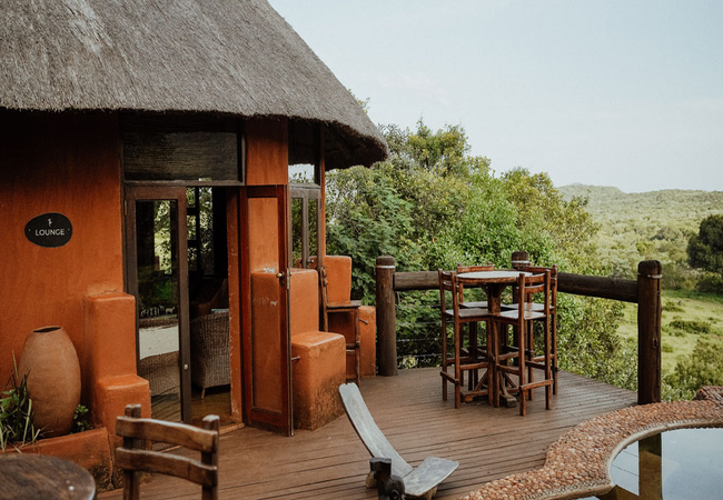 Duvha is a luxury secluded unit furnished with a King-size bed with 100% cotton linen. The en-suite bathroom is fitted with a bath, double shower, toilet, basin and outdoor shower. There is a dining room and lounge area with a gas heater. There is a fully fitted kitchen and a deck with a private plunge pool, braai area and outdoor seating.