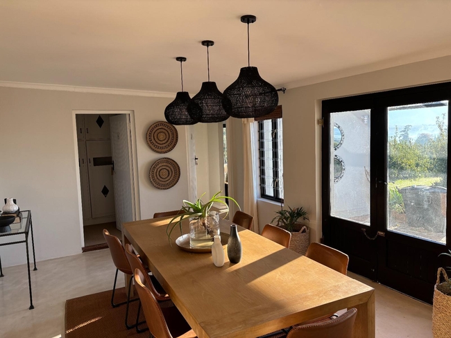Libertas House is a generously proportioned four-bedroom farmhouse located at Cheverells Farm in the Elgin Valley. The holiday house offers refined comfort and a classic country experience, ideal for families or groups of up to eight guests. Each bedroom is furnished with a king-size bed dressed in premium 400-thread-count linen, and includes its own private en-suite bathroom for maximum comfort and discretion. One bathroom features a deep bathtub, while the remaining three are equipped with walk-in showers, washbasins, and toilets. Heated towel rails and plush towels are provided to elevate your stay. At the heart of Libertas House lies an expansive open-plan living area, seamlessly combining a fully equipped kitchen, a warm and inviting lounge, and a sociable dining space. The kitchen includes a gas hob, electric oven, microwave, and all necessary cookware and utensils, making it well-suited to both relaxed cooking and more festive occasions. The indoor fireplace and wall-mounted heaters provide a snug atmosphere during cooler months, while an electric fan offers relief in warmer weather. Step outside onto the covered stoep, thoughtfully furnished for comfort, where you can unwind while enjoying uninterrupted views across the surrounding orchards. A built-in braai area completes the setting—perfect for enjoying slow, open-air meals in true countryside style. Guests are welcomed with thoughtful touches including Nespresso pods, a selection of teas, sugar, and homemade-style farm rusks. Kindly note: only children aged 12 and above are accommodated, and a minimum stay of two nights is required.