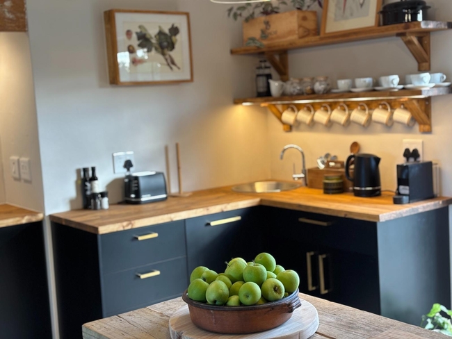 At the heart of Libertas House lies an expansive open-plan living area, seamlessly combining a fully equipped kitchen, a warm and inviting lounge, and a sociable dining space. The kitchen includes a gas hob, electric oven, microwave, and all necessary cookware and utensils, making it well-suited to both relaxed cooking and more festive occasions. The indoor fireplace and wall-mounted heaters provide a snug atmosphere during cooler months, while an electric fan offers relief in warmer weather.