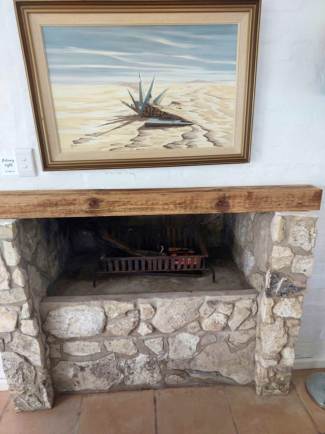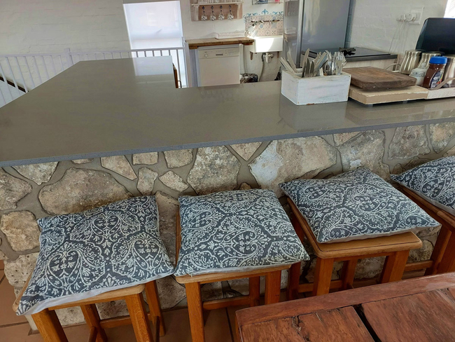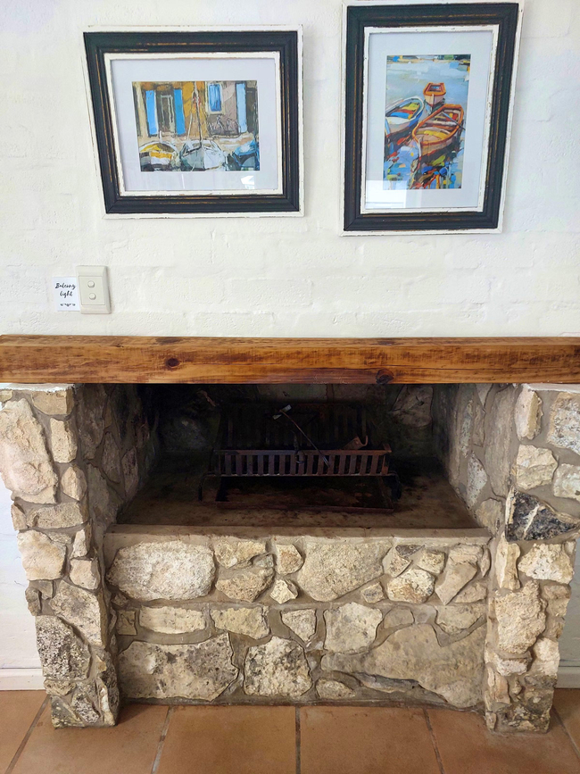 The open-plan living area includes a fully equipped kitchen with a gas stove, electric oven, microwave, fridge-freezer, dishwasher, and all necessary cutlery and crockery, complemented by a breakfast bar with stools. Adjacent to the kitchen is a six-seater dining table, perfect for shared meals. The lounge area offers comfortable leather couches, a fireplace, and a television with DStv, while guests can also enjoy complimentary Wi-Fi throughout the property.
