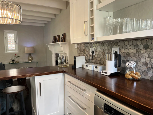 This exclusive self-catering residence features a single en-suite bedroom designed to offer the utmost in privacy, elegance, comfort, and romance. Lilliput House has earned a reputation for its meticulous attention to detail, creating an atmosphere where every element feels carefully considered. The bedroom is tastefully appointed, showcasing pristine white Percale linen, a soft feather duvet, and mohair blankets atop an antique bed. A restrained monotone interior palette is beautifully offset by polished wooden floors adorned with rich Persian rugs, while original artworks bring character and charm to the walls. Indulgence is part of the experience, with thoughtful touches such as sparkling wine, fine sherry, Belgian chocolates, home-baked biscuits, fresh flowers, and seasonal fruit awaiting your arrival. The bathroom offers its own sense of luxury, featuring a graceful slipper bath set beneath a stained-glass window. Plush bath sheets, fragrant oils, bath crystals, and the warm glow of candles invite you to linger and unwind. An upper-level wooden deck frames sweeping mountain views, allowing you to savour the outdoors from the comfort of your room. Here, you can relax with nature as your companion, watch the sun slip below the horizon, or enjoy the warmth of an open fireplace during the colder months. The open-plan living and dining areas on the ground floor lead out to a secluded terrace, where the beauty of the well-tended garden and its vibrant birdlife provide a serene backdrop. Dining options abound, whether you prefer to sample the fare at the many nearby restaurants and pubs, or prepare your own culinary creations in the fully equipped kitchen. A picnic basket can also be arranged for a leisurely al fresco meal beneath a romantic garden gazebo. For your comfort and convenience, the property includes two decks with scenic mountain vistas, an open fireplace, a fully equipped kitchen with a stove, microwave, fridge stocked with refreshments, and a hospitality tray. Additional features comprise barbeque facilities, air-conditioning and a fan, quality linen and towels, plush bathrobes and slippers, a hairdryer, a small library, a secure safe for valuables, and a mini hi-fi system.