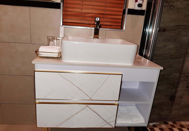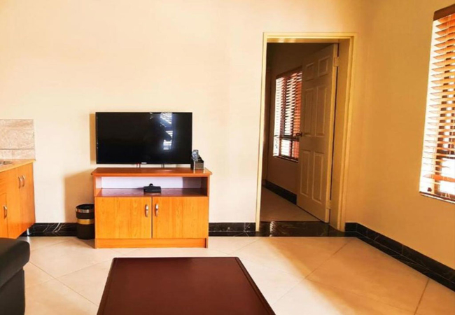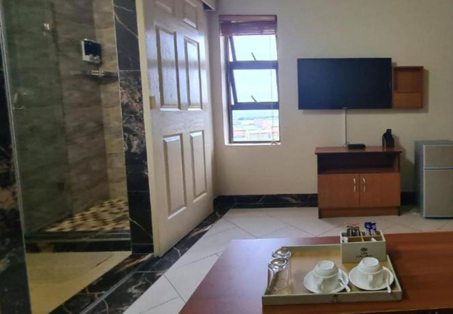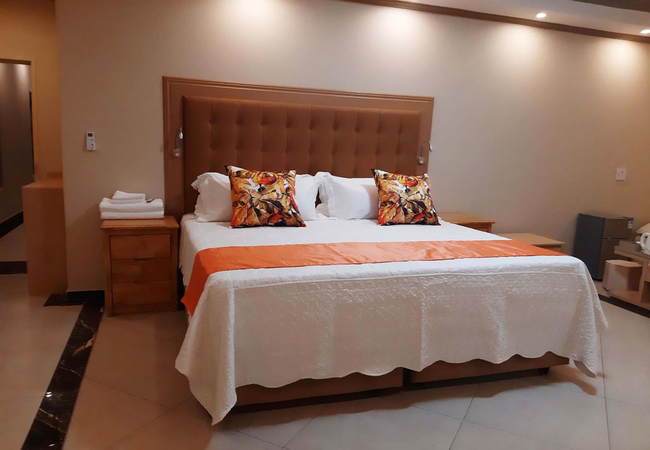 The Presidential Room is furnished with a King-size bed and the en-suite bathroom is fitted with a shower, toilet and basin. There is a lounge area. This room is linked to the boardroom facility. Each room has a TV with satellite channels, mini-fridge, and tea / coffee making facilities. Free Wi-Fi is available throughout the property.