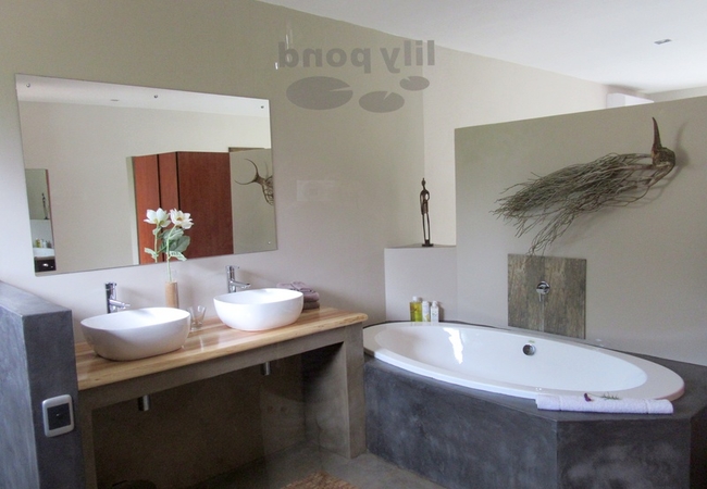 Spacious Air-Conditioned room(34m2) with 3.5m sliding doors opening onto a private terrace with view over our beautiful lily ponds and forest. All equipped with King or Twin beds, TV, WIFI and bathroom with double basins, rain-shower and bath.