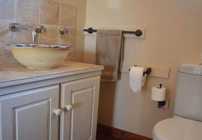 Lindani Thabeng is a self catering holiday cottage sleeping four guests. The cottage has two large bedrooms each furnished with King-size beds which can be converted into twin beds. Each room has an en-suite bathroom fitted with a shower, toilet and basin. The fully equipped kitchen is equipped with a four-plate gas stove with oven, solar electric fridge and gas freezer. No electric kettles, toasters or hair dryers are permitted. Lighting is provided by solar and hot water by gas geysers. No plug points available, please bring a car/laptop charger if you need it. No dishwasher. There is a dining area and a comfortable lounge with a fireplace. Outside is an undercover patio with a table and chairs and a gas braai. There is also a braai area and fire pit in the garden as well as a private swimming pool.