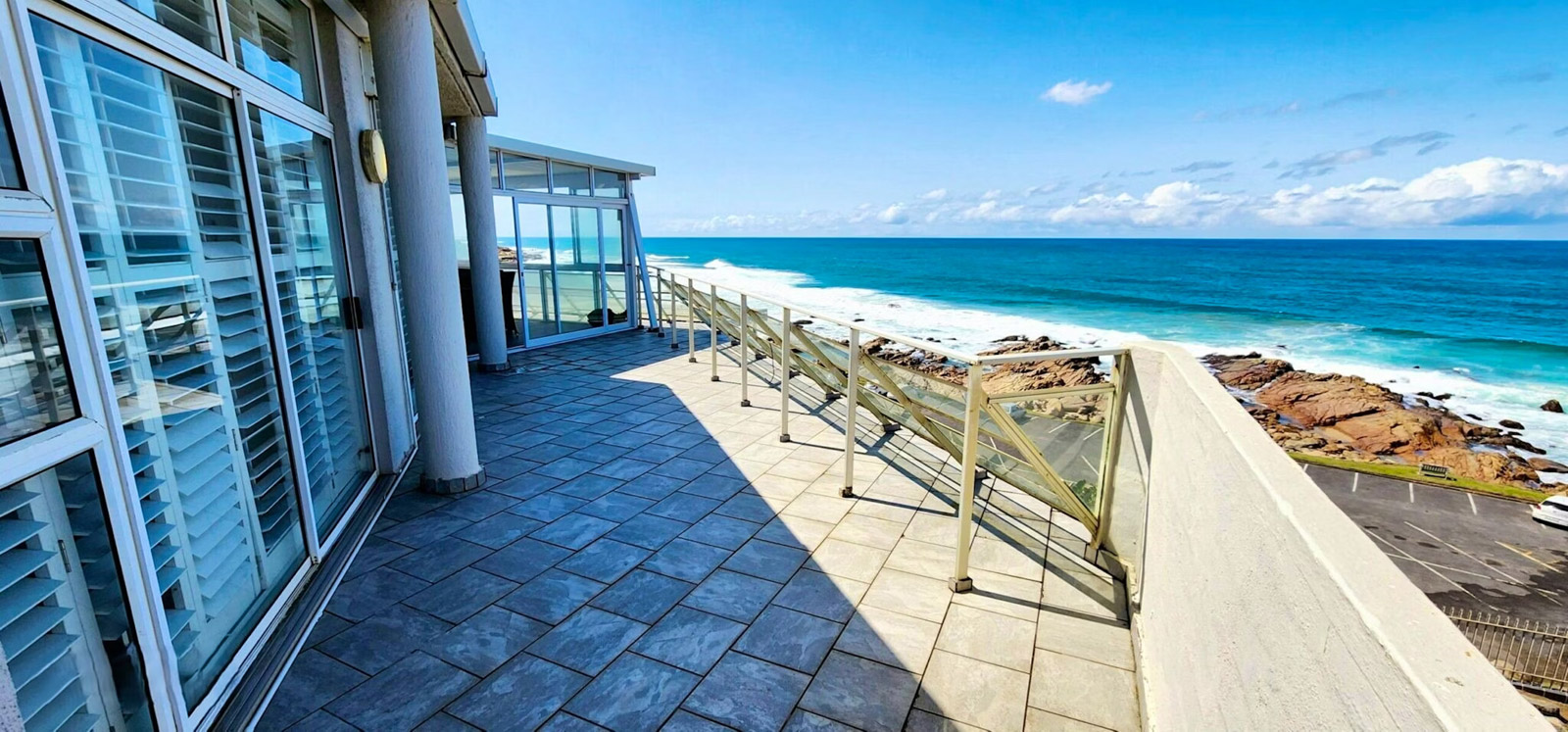 Linden Terrace 5 is a contemporary, tastefully appointed apartment offering secure accommodation with three bedrooms and two bathrooms. The property enjoys uninterrupted 180 degree sea views, with the ocean located approximately 80 metres away. The lounge and bedrooms all feature expansive glass and aluminium sliding doors that open onto a generous tiled patio on the sea-facing side, partially enclosed to provide both shelter and privacy.