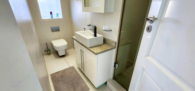 The main bedroom is furnished with a queen-size bed and is complemented by a modern en-suite bathroom fitted with a shower, toilet and basin. The second bedroom also features a queen-size bed, while the third bedroom is equipped with a bunk bed comprising a double bed below and a single bed above. These two bedrooms share a modern bathroom, which includes a shower, toilet and basin. All three bedrooms are fitted with air conditioning units operated on a convenient pay-as-you-go system for added comfort.