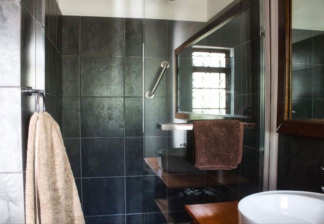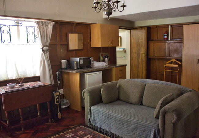 Room 7 is furnished with twin beds and a fold-out sleeper sofa. The en-suite bathroom is fitted with a bath, shower, toilet and basin. Each individually decorated room contains a bar fridge, tea/coffee with complimentary rusks, TV with an OpenView decoder, Wi-Fi, as well as a heater and a portable or ceiling fan.
