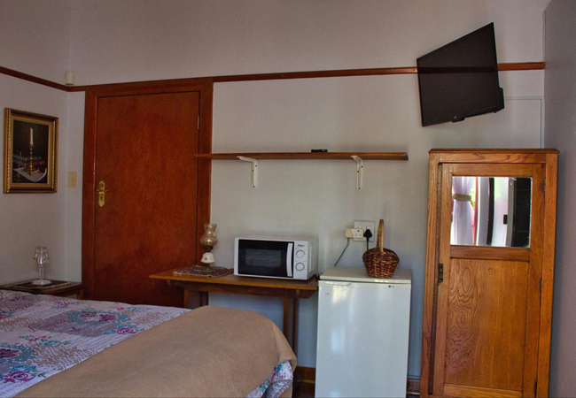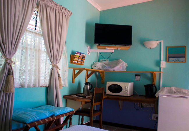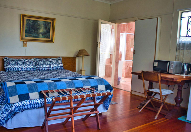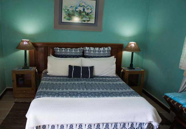 Blue Room 2 is furnished with a double bed. The room has an en-suite bathroom fitted with a shower, toilet and basin. Each individually decorated room contains a bar fridge, tea/coffee with complimentary rusks, TV with an OpenView decoder, Wi-Fi, as well as a heater and a portable or ceiling fan.