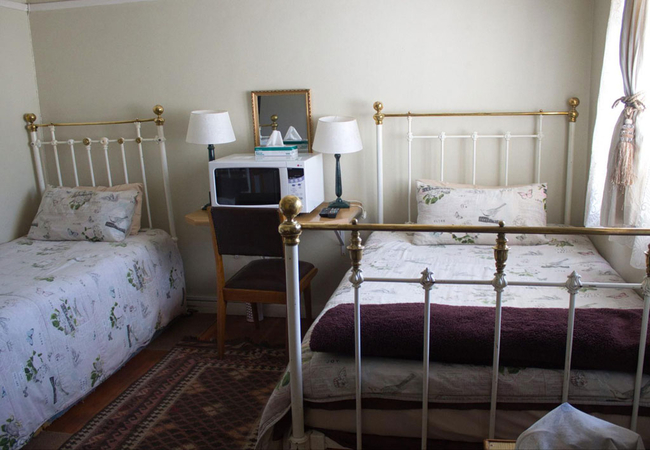 Bont Room 6 is furnished with two single beds. The room has access to a shared bathroom fitted with a shower, toilet and basin. Each individually decorated room contains a bar fridge, tea/coffee with complimentary rusks, TV with an OpenView decoder, Wi-Fi, as well as a heater and a portable or ceiling fan.