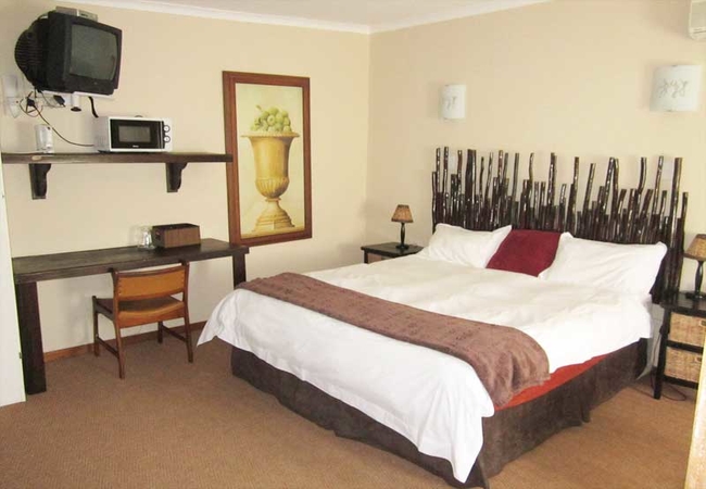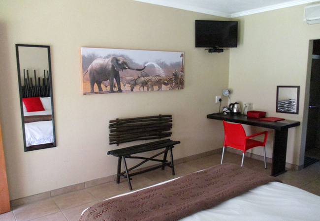 Room furnished with a double bed and an en-suite bathroom fitted with a shower, toilet and basin. The room is equipped with a TV, DSTV Hospitality package, kettle, coffee, tea, aircon (cool and heat) and a desk.