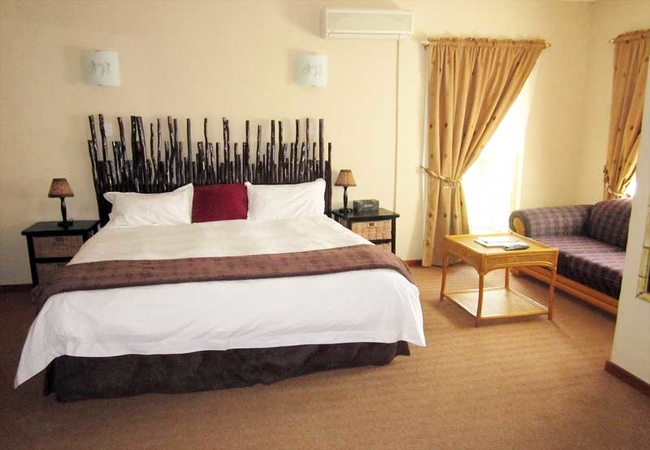 Room furnished with a King-size bed and an en-suite bathroom fitted with a jet bath, shower, toilet and two basins. The room is equipped with a TV, DSTV Hospitality package, kettle, coffee, tea, microwave, aircon (cool and heat), desk, couches and a luggage rack.