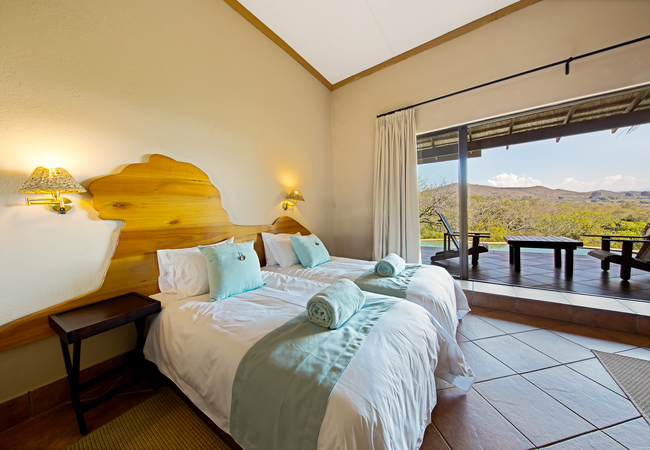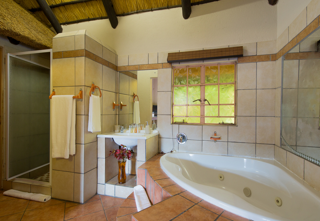 The Luxury Twin Chalets are beautifully appointed, each with spa-bath in spacious bathroom; King-size bed / twin beds if required; microwave oven; bar-fridge; complimentary tea / coffee; lounge suite; DVD viewing in chalet; and your own private plunge pool off veranda with stunning views. All chalets have TV with DStv.