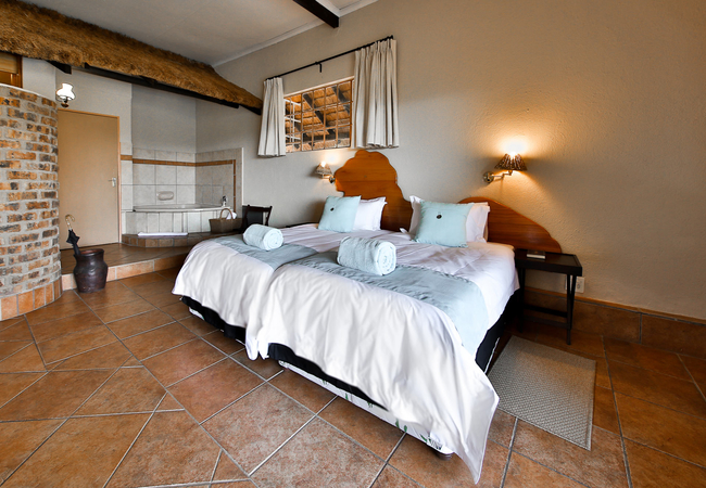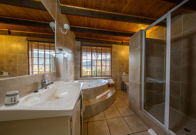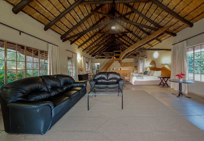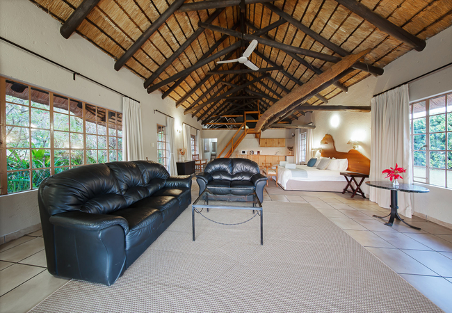 The Deluxe Family Chalet is beautifully appointed and has one three-quarter bed and one King-size bed. Each with spa-bath in spacious bathroom; King-size bed; microwave oven; bar-fridge; complimentary tea / coffee; lounge suite; DVD viewing in chalet; and your own private swimming pool off veranda with stunning views. All chalets have TV with DStv.