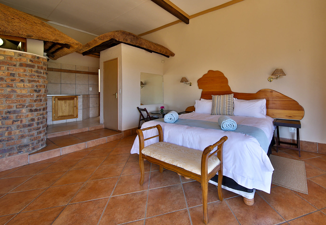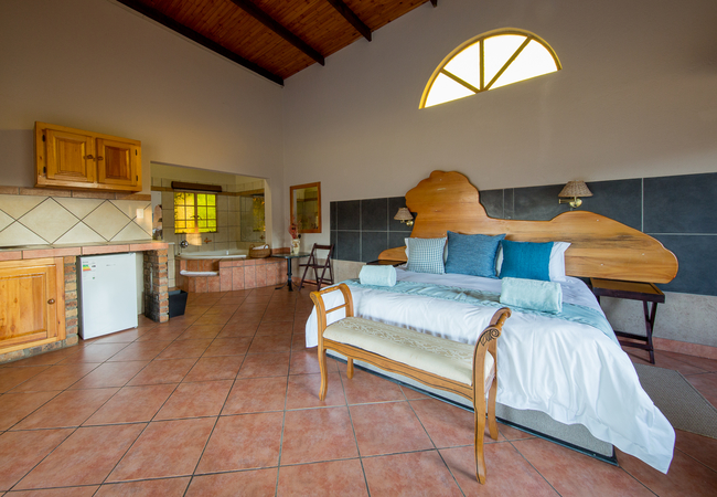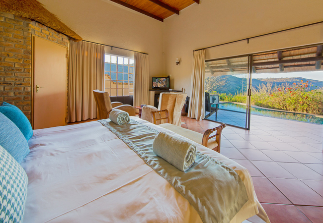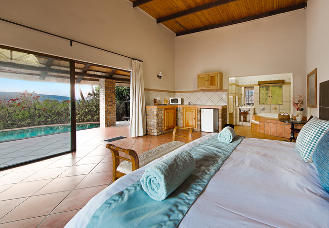 The Luxury King Chalets are beautifully appointed, each with spa-bath in spacious bathroom; King-size bed; microwave oven; bar-fridge; complimentary tea / coffee; lounge suite; DVD viewing in chalet; and your own private swimming pool off veranda with stunning views. All chalets have TV with DStv.