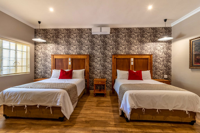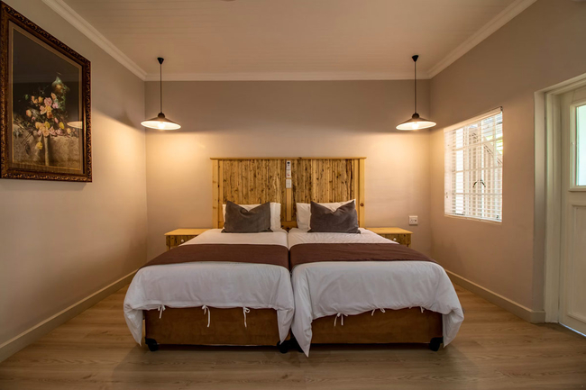 This comfortable room contains 2 three-quarter bed and an en-suite bathroom fitted with a shower. All rooms are equipped with ‘no noise’ fridges, air-conditioning, free Wi-Fi and a TV with selected DStv channels.
