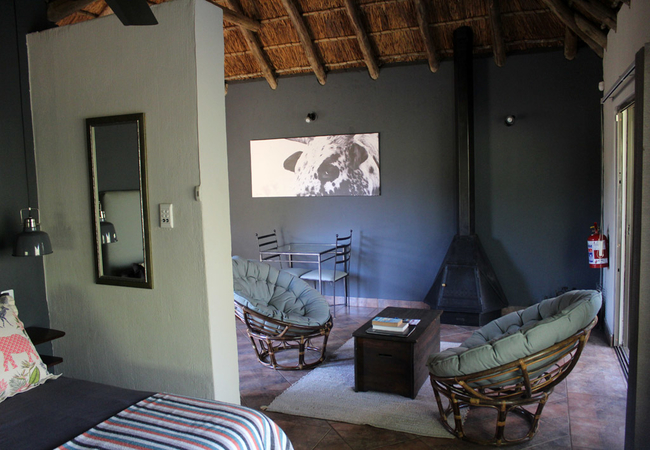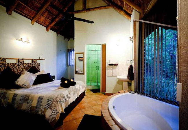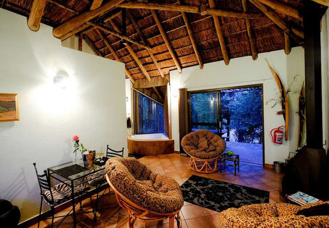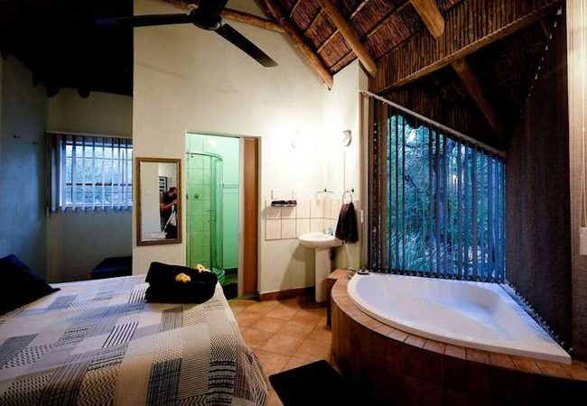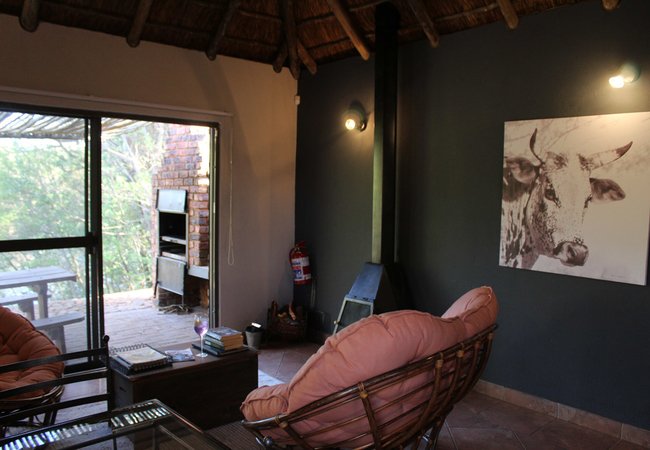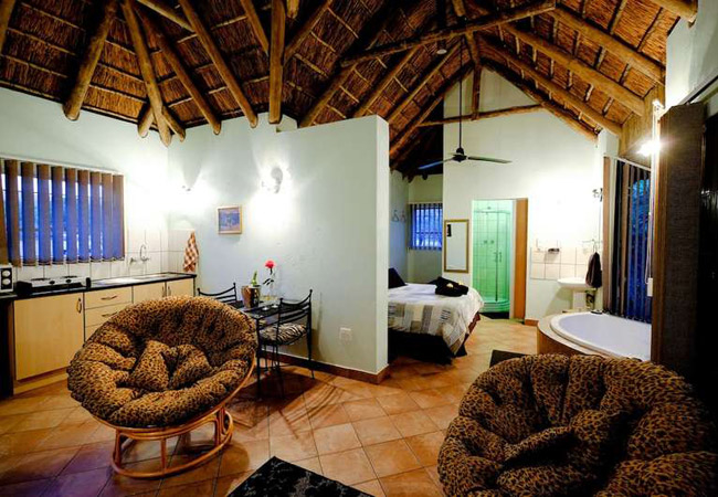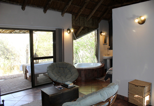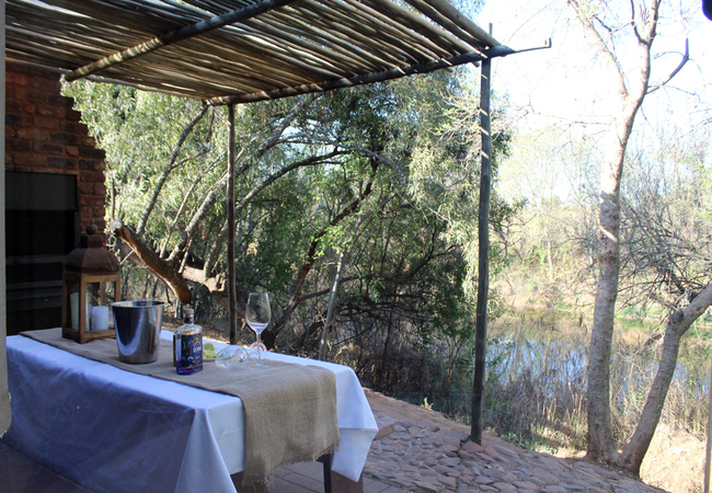 The chalet has a corner bath which overlooks the river yet is totally private from any angle. They also have a bathroom with a shower. There is an inside fireplace, kitchenette and an outside private patio braai. The chalets are equipped with a fridge, double hot plate stove, microwave, linen, cutlery and crockery.