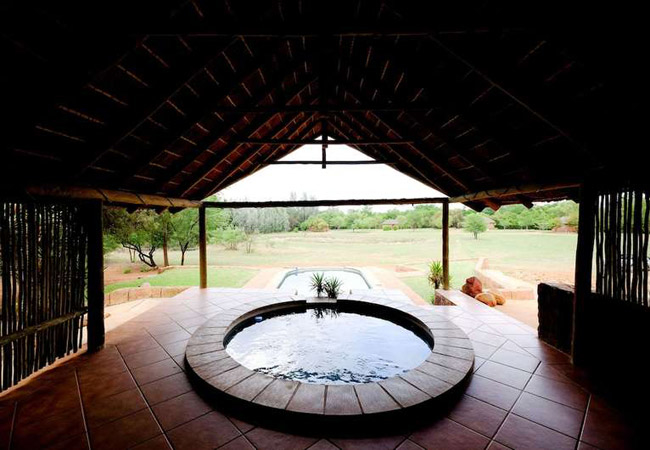 In the centre of the horseshoe, slightly elevated is the communal Lapa which has a whirl pool, an infinity swimming pool, a grassy area ideal for a braai and then the inside braai and serving counter, ideal for chilly winters.