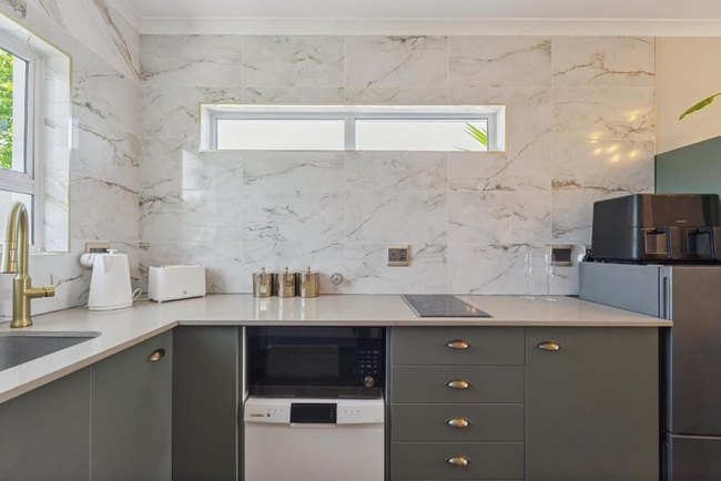 The central living area includes a well-equipped kitchen designed for practical, everyday use. It features an induction plate, air fryer, microwave, and fridge, along with facilities for preparing tea and coffee. Meals can be enjoyed at the dining table, while the adjoining lounge provides comfortable seating and a Smart TV with access to streaming services. High-speed Wi-Fi is available throughout, allowing guests to remain connected with ease.