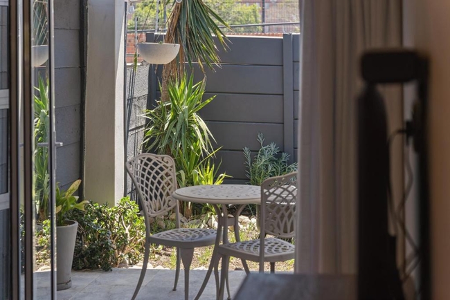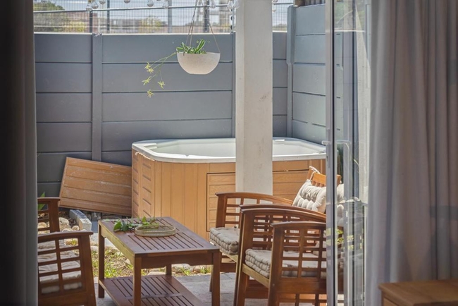 Outdoors, guests can enjoy a private patio and garden area furnished for relaxation. This inviting space is well suited to a quiet morning coffee or a relaxed evening drink. A private jacuzzi is positioned within the garden, offering an additional element of comfort and leisure.