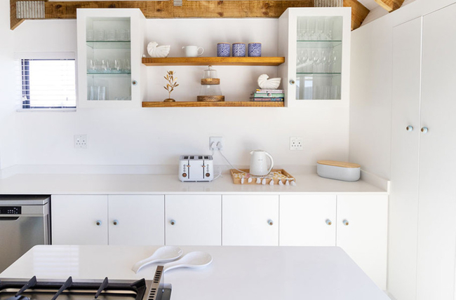 The open-plan layout enhances the sense of flow between the expansive living area and the fully equipped kitchen, creating an inviting space for socializing. Modern conveniences, including a gas hob, electric oven, microwave, fridge-freezer, dishwasher, and coffee-making facilities, cater to all self-catering needs.