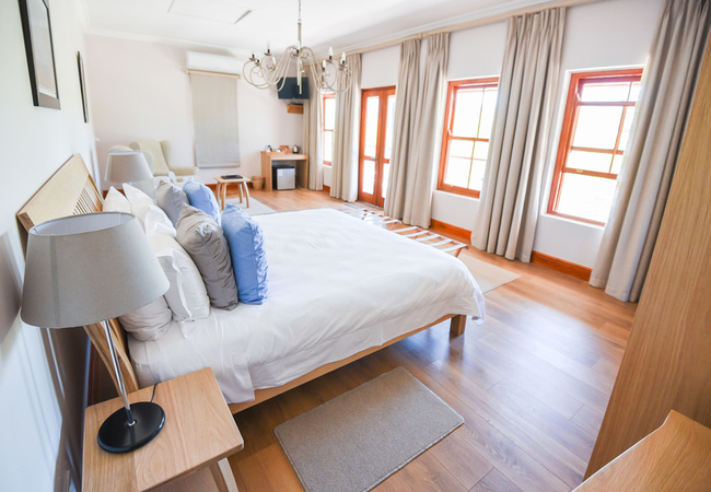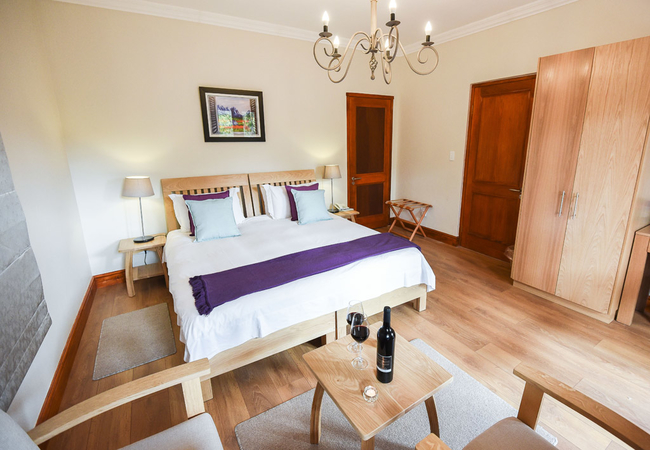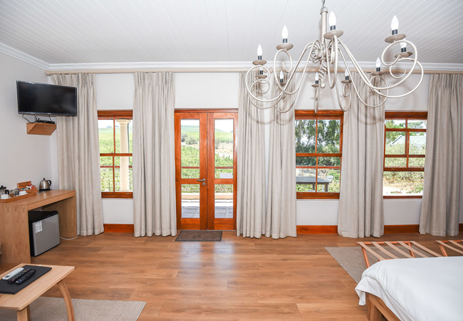These rooms have a King-size / twin beds and en-suite bathroom with shower. The room opens onto a balcony overlooking the vineyards. Each room has air-conditioning, safe, minibar, hairdryer, shaver plug and coffee / tea for you to enjoy in the room or outside on the verandas. The rooms all have a TV with selected satellite channels. We spoil our guests with Lovane's own range of locally produced bathroom toiletries, gowns and slippers.