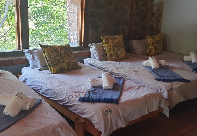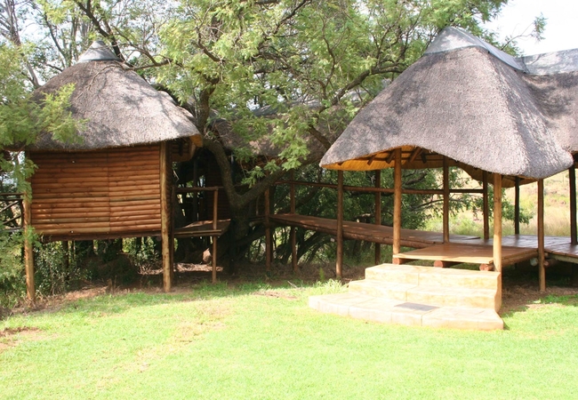 A unique experience! Three log cabins perched above the Wilge River with private deck/lounge with walkway to spacious bathrooms. Perfectly situated thatch rooms, built in the treetops with a magnificent view and deck almost right on the river. There are three log cabins share a kitchen and a braai and there are two bathrooms between the three rooms. Each unit has a coffee station, a fridge, kettle, hot plate and microwave.