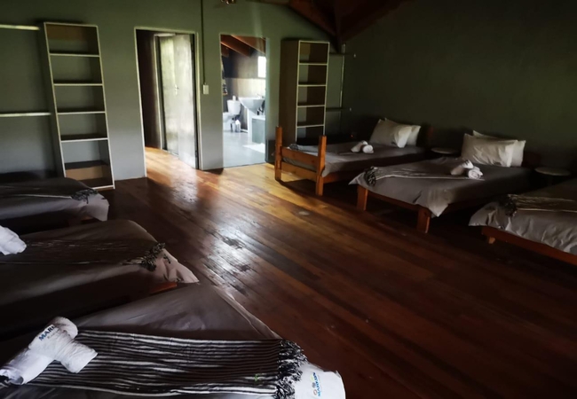 River Villa 2 is a 10 sleeper unit near the waters edge and is situated between River Villa 1 and 3. It consists of a large open plan lounge, dining room and full kitchen area fitted with a microwave, fridge and gas stove. The large glass sliding doors in the lounge will soon boast with a deck onto the river. The main bathroom with modern fittings is downstairs and is fitted with a shower and bath. The first bedroom is downstairs and has a double bed with a private ensuite (with shower). The second bedroom has a double bed with ensuite (bath and shower) as well as a small intimate balcony overlooking the entrance and boma area. Villa 2 also consists of a large loft above the lounge area with 6 single beds. River Villa 2 has a built in Braai/BBQ area and a fire pit. This unit is great for outdoor family and group gatherings