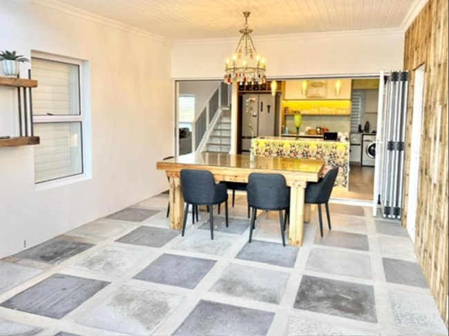 Glass folding doors open onto an undercover patio, where a large dining table and chairs provide a pleasant setting for outdoor meals. A built-in braai enhances the space, making it well suited for relaxed entertaining.