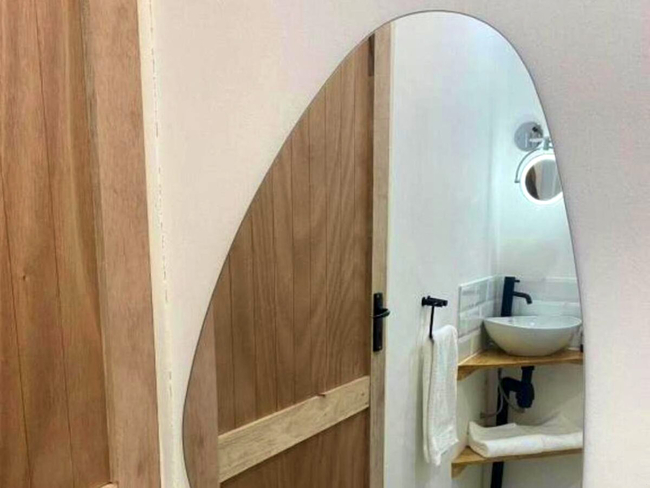 The open-plan interior includes a comfortable lounge with a Smart TV, a cozy reading nook with a handpicked selection of books, and a fully equipped kitchen complete with a fridge-freezer, two-plate induction stove, microwave, air fryer, toaster, and coffee machine.