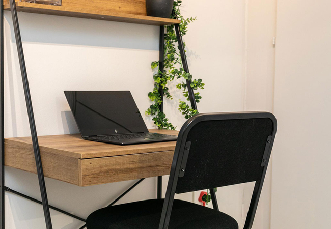 There is a comfortable lounge area with a TV, Wi-Fi and a dining table where you can enjoy your meals. Outside is a patio with a table and two chairs.