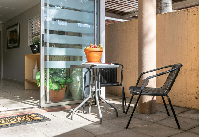 Madison Palms 28 is a self catering holiday apartment in Sandown sleeping two guests. The studio is furnished with a Queen-size bed. The bathroom is fitted with a shower over the bath, toilet and basin. Linen and towels are provided. The kitchen has a fridge, microwave, stove, oven, kettle, toaster, iron and ironing board as well as cutlery and crockery. There is a comfortable lounge area with a TV, Wi-Fi and a dining table where you can enjoy your meals. Outside is a patio with a table and two chairs.