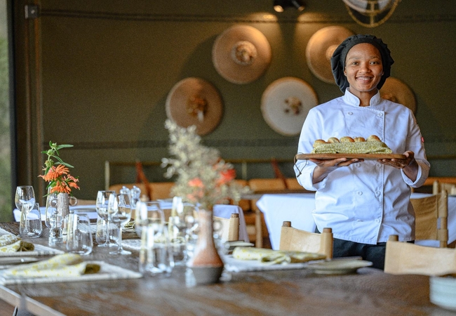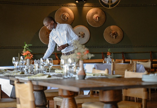 Leather couches and an 8-seater table create inviting spaces for reading, gathering, or engaging in board games. Overlooking the river, the infinity pool provides a breathtaking vista where guests can cool off, soak up the sun, and observe wildlife drinking. Seamlessly blending with the natural environment, the pool's location and design provide an immersive and unforgettable experience. In addition to its other remarkable features, Madwaleni River Lodge boasts a magnificent 2000-bottle wine cellar with a curated collection of the Cape's finest, rarest and most unusual wines.