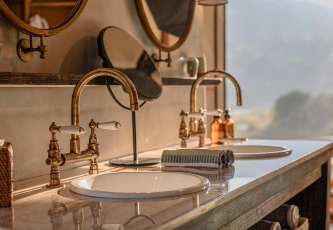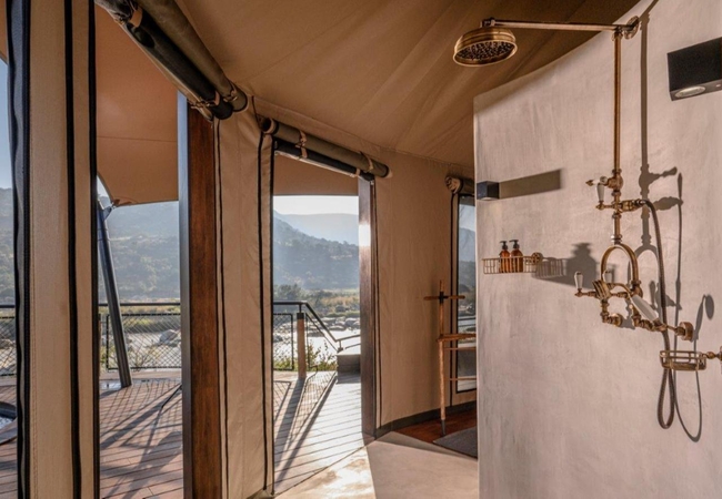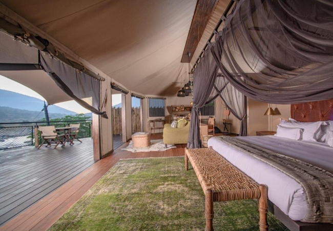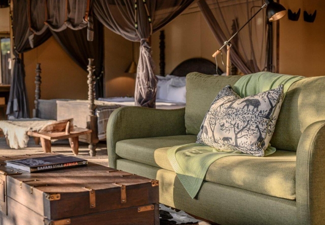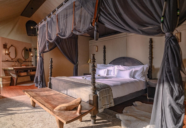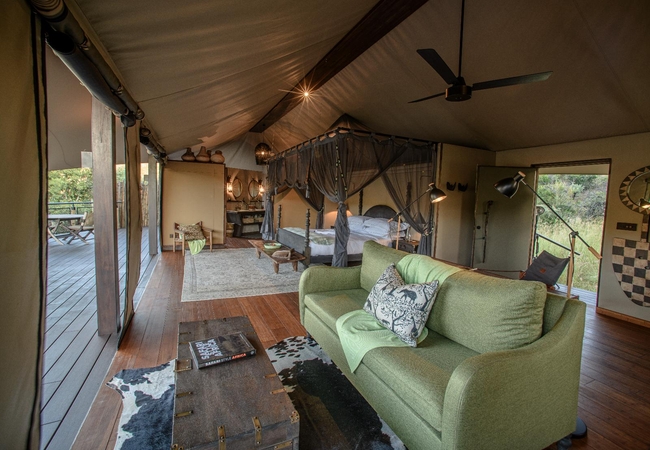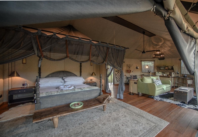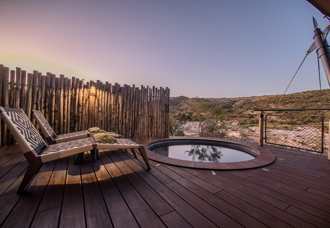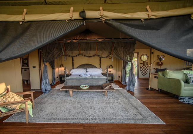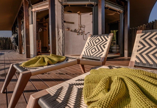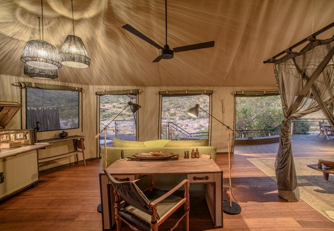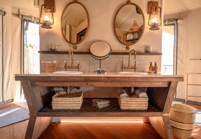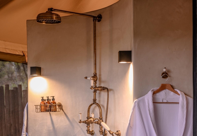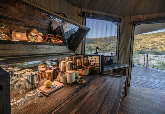 The Luxury Tents are furnished with twin beds that can convert to King-size beds, ceiling fan and mosquito net. The en-suite bathroom is fitted with a shower, toilet and dual vanities. A drink, tea and coffee station are available and the lounge area opens to a deck with a plunge pool.