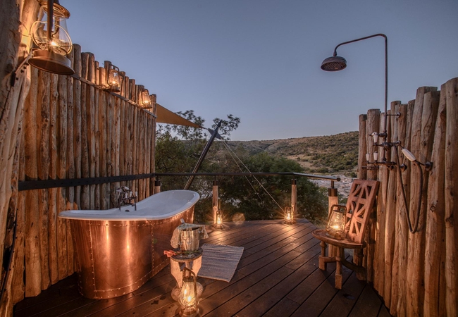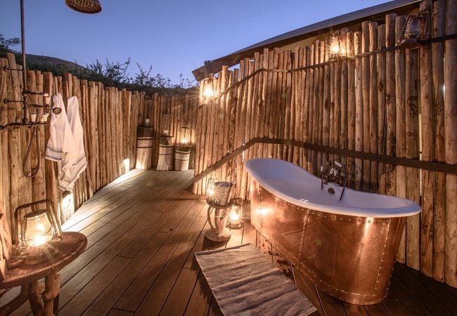 The Romance Luxury Tent is furnished with a King-size bed, ceiling fan and mosquito net. The en-suite bathroom is fitted with a shower, toilet and dual vanities. This suite also has an outdoor shower and bath. A drink, tea and coffee station are available and the relaxing lounge area opens to a deck with a plunge pool.