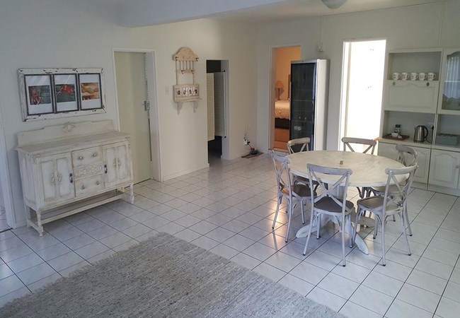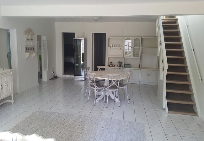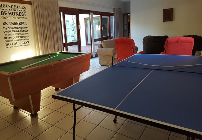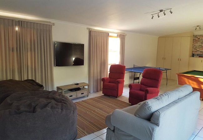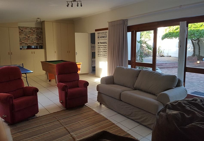 The spacious, open plan living area is comfortably furnished and includes DStv, a table tennis table and a pool table. There is a fully equipped kitchen and an eight seater dining table where meals can be enjoyed together.