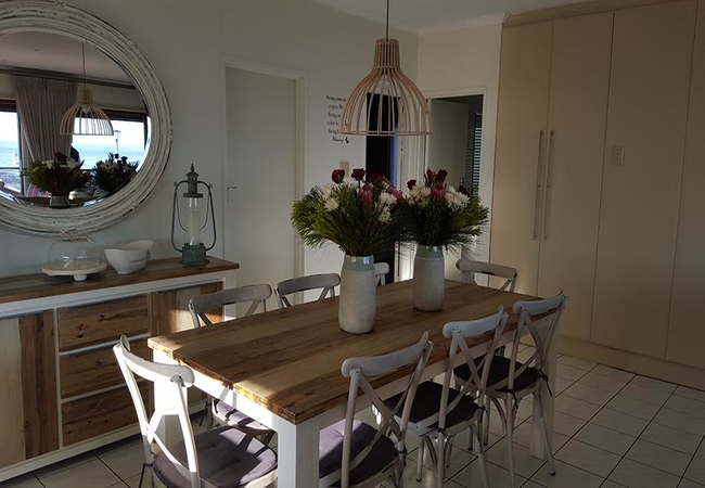 The gorgeous, fully equipped self catering Holiday Home in Hermanus is furnished with custom designed piece as well as carefully selected fabrics and finishes giving the house style and elegance. There are five bedrooms and four bathrooms. Four of the bedrooms are furnished with King-size beds and one has twin beds. Bed linen and towels are provided. The spacious, open plan living area is comfortably furnished and includes DStv, a table tennis table and a pool table. There is a fully equipped kitchen and an eight seater dining table where meals can be enjoyed together. The living area opens onto a patio with braai facilities and wonderful views. MaFaRi Beach House has a spacious garden with a swimming pool and a large wooden table under shady trees. Five bedrooms Four bathrooms A spacious living room with two flat screen televisions, DSTV A patio braai area Lock-up garage Laundry Large games room with a flat screen TV, dart board, table tennis, and a pool table Spacious back yard, with a splash pool and a big wooden table under the trees All duvets, fresh bed linen, and towels are provided. Facilities: Wi-Fi Double garage Laundry area