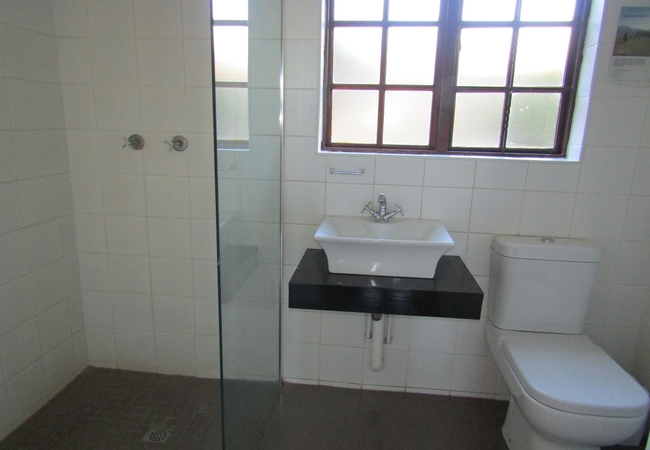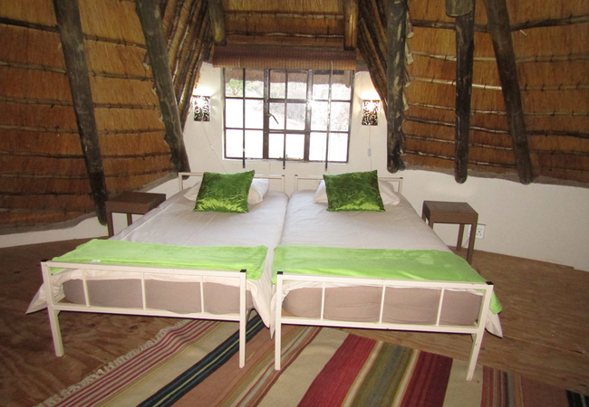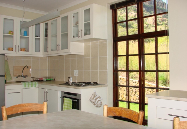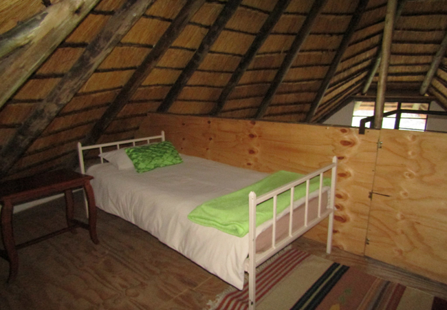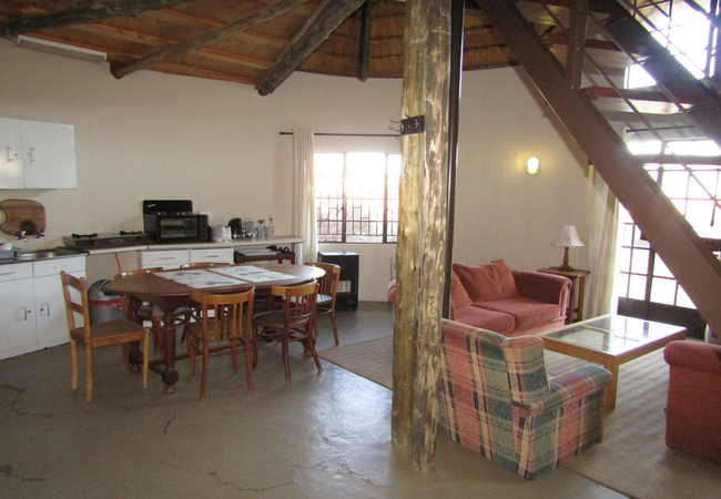 This unit sleeps 2-5 people. This is a large and spacious unit which is perfect for a couple, a group of friends or a family. There is a spacious open-plan living area on the ground level, with twin beds, as well as a dining and a sitting area and wonderful views of the mountain. There is a staircase leading to the loft bedroom which has twin beds with foam mattresses and a third single bed. There is a small veranda and its own braai facilities. It has a bathroom with a bath, a shower over the bath, a basin and a toilet. Bed linen and towels are provided. The Rondawel has a fully equipped kitchenette with a standard fridge/freezer, a gas hob, a small convection oven, a microwave oven, a toaster and a kettle and everything you need to prepare and serve simple meals.
