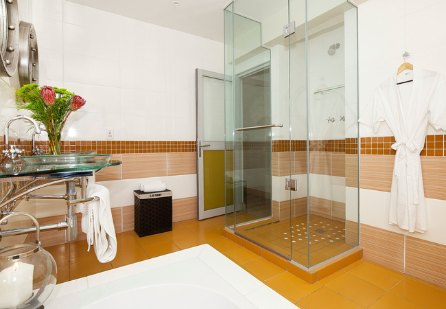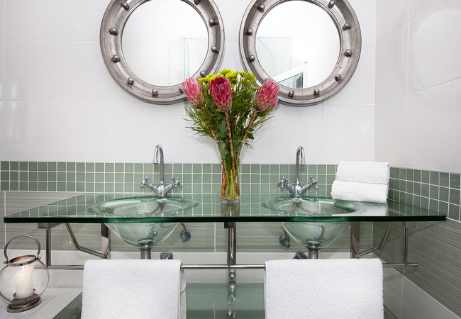 We have two guest lounges (one sea facing), lounge, dining room and balcony with majestic views of False Bay. The other guest lounge faces Table Mountain National Park. There is no TV in lounges but music, books, magazines are provided. The lounges have modern decor with plush sofas and easy chairs. Both are very spacious with spectacular views, interesting art and beautiful decorative pieces.