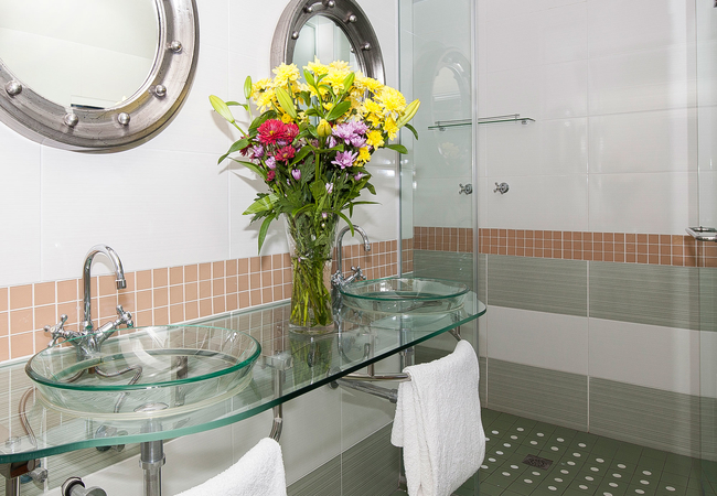 All rooms have king or twin beds with excellent quality white cotton linen and a particularly spacious bathroom with quality taps, tiles and fittings. White towels and face cloths are provided. All bathrooms have big baths and large showers as well as double hand basins and mirrors. Extra touches in these bathrooms including tissues, shower caps, shoe mitts, vanity and sewing kits.