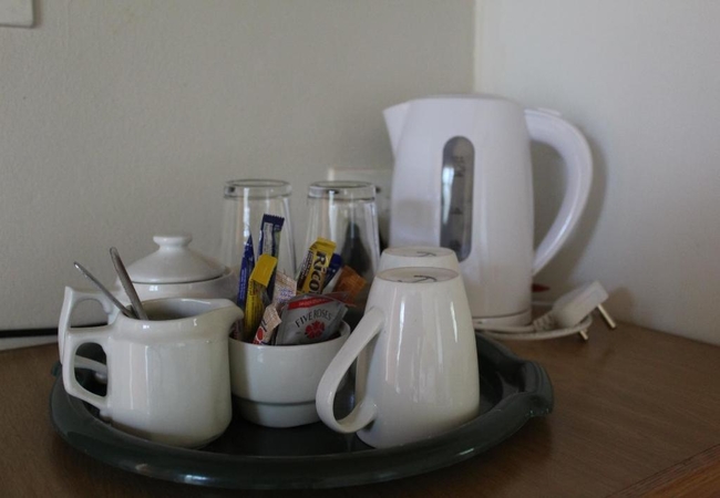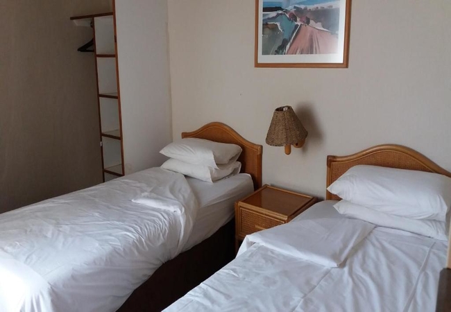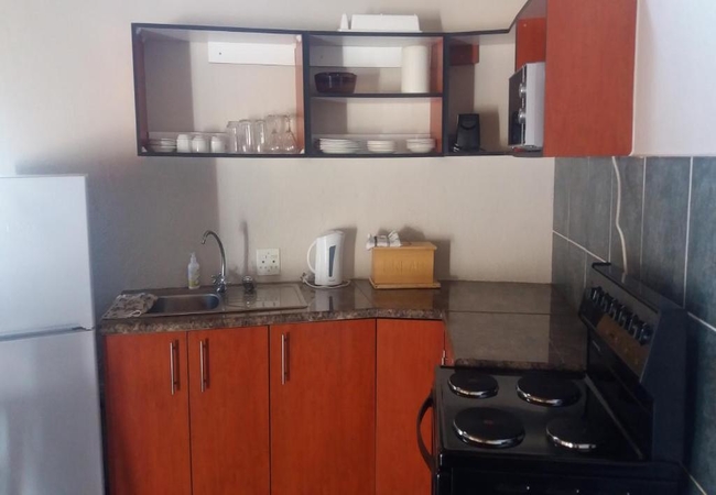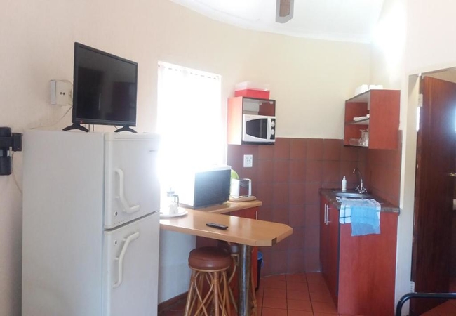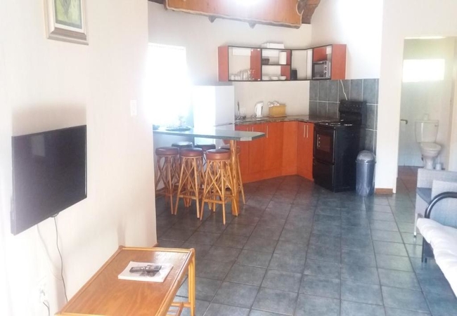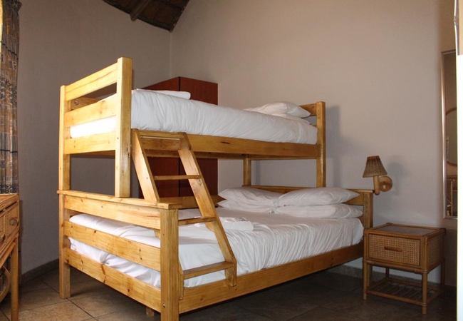 The Five-Sleeper Self-Catering Chalet is a two bedroom chalet that sleeps four guests. The first bedroom is furnished with a double bed. The second bedroom is furnished with two single beds. The bathroom is equipped with a bath, hand basin and toilet. There is an open plan kitchen and lounge with a sleeper couch suitable for one child under 12 years old. There is a patio and braai. Television with selected DSTV channels.