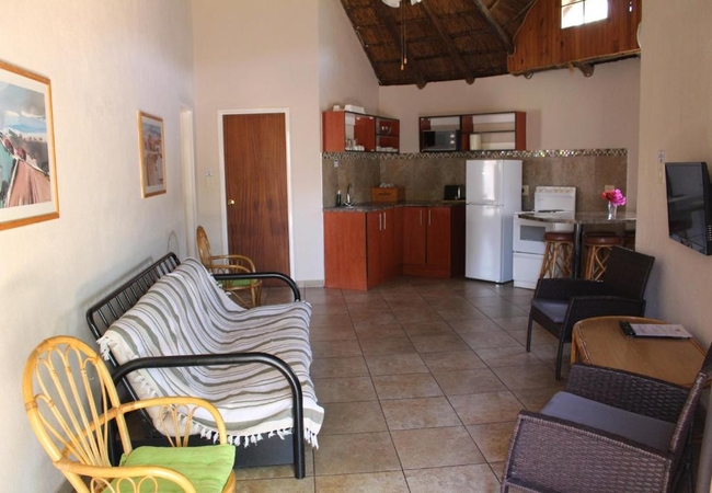 The Two-Sleeper Self-Catering Chalet has one bedroom furnished with a double bed (please request twin or two single beds if preferred) and there is a sleeper couch for one additional child under 12 years. The bathroom is equipped with a bath, hand basin and toilet. There is a spacious open plan kitchen and lounge, with patio and braai. Television with selected DSTV channels.