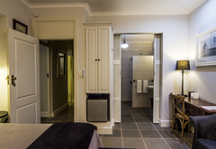This suite has a King-size bed that can be converted into twin beds if preferred. There is an en-suite bathroom with a bath and a shower.