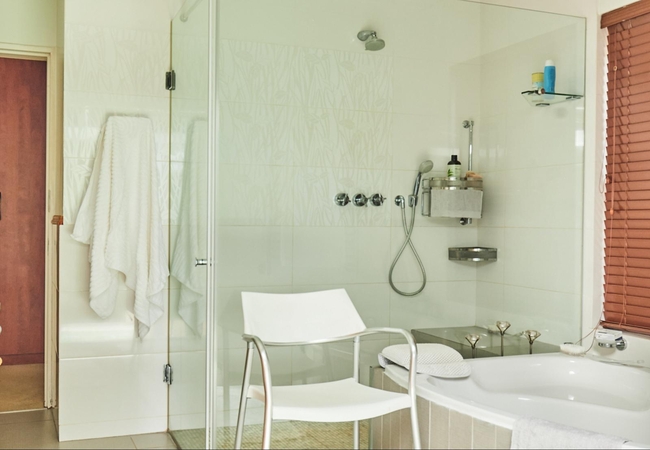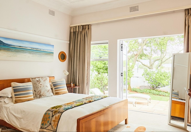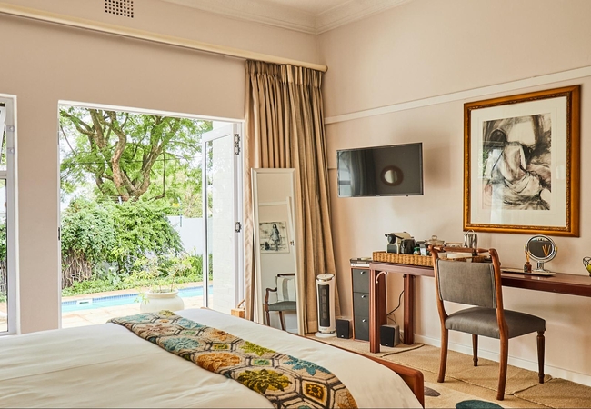 The Protea Room is a classically spacious en-suite bedroom furnished with a Queen-size bed. The room has with pool views and includes a modern bathroom equipped with a bath, walk in shower and hand basin. There is a separate toilet room. This is the only room that will give access to the parking garage. The room is equipped with a TV with DStv. a bar fridge, tea- and coffee-making facilities, and Wi-Fi.