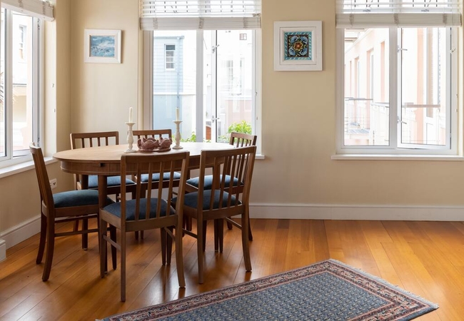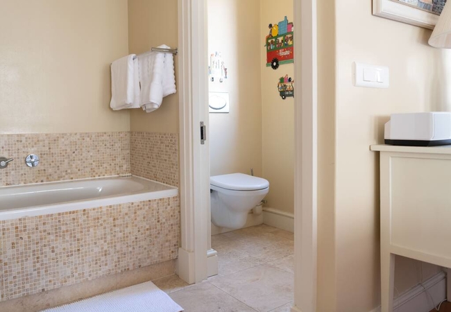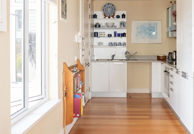 The living area has comfortable furniture and a six seater dining table for guests to enjoy meals at, however, there is no TV in the apartment. The kitchen has modern appliances and contains a stove, oven, tea / coffee making facilities, microwave and a toaster.